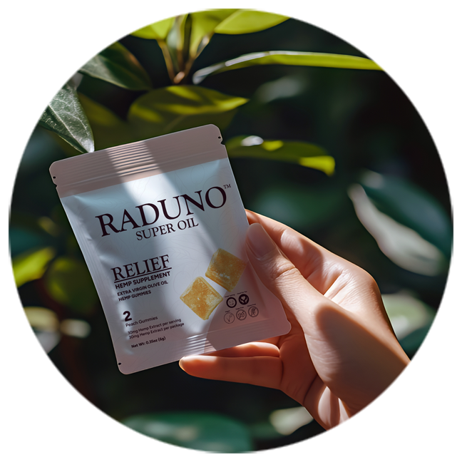Lab-tested, federally compliant, and made with U.S.-grown hemp and organic extra virgin olive oil, Raduno Relief gummies are the hemp wellness supplement for comfort and recovery you'll actually enjoy taking — plant-based, sugar-free, and designed for daily use.